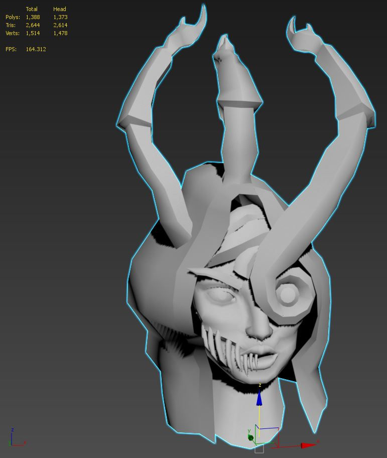 To get the general feel of the character out of my head I did a quick sketch showing how I wanted the form to flow, I also wanted one of her eyes to be nestled in a horn growing out of her face. Using the mask method I used in my last project, I knocked out 4 designs and then decided on the strongest one. In this case it was the 3rd silhouette; she exhumes an effortless power which I quite like. Also her top heavy figure makes her look strong and pretty badass.