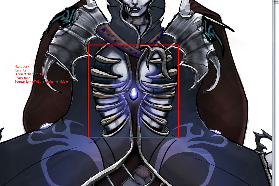 With the concept my tutor said that the torso looked a bit too busy and should perhaps be a it more dark blue, to remedy that I did a simple paintover and increased the glow of the gem which was previously being a bit lost.